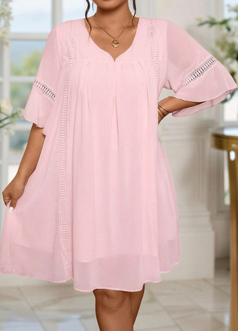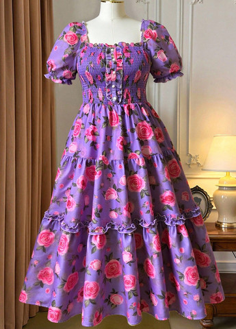 Женское платье в стиле пэчворк SHEIN LUNE больших размеров. V-образный вырез и рукава-воланы. Расклешенный подол.