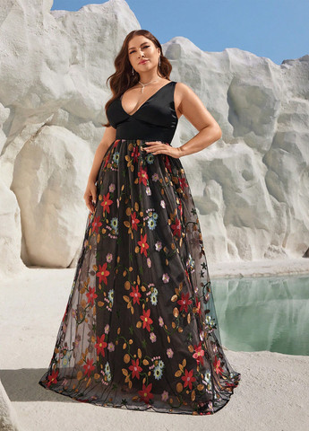 Элегантное атласное платье – черное. Это черное атласное платье предлагает изысканный образ для особых случаев. Оно украшено цветочной вышивкой и глубоким V-образным вырезом. Платье имеет высокую талию и расклешенный подол. Оно включает контрастную сетчатую спинку и застежку-молнию. Ткань слегка тянется для комфорта. Карманы не включены.