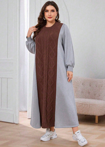 Платье-свитшот SHEIN Najma — удобный вариант plus size для ношения осенью и зимой. Оно имеет круглый вырез и стандартный крой. Платье имеет разрез и вшитые рукава. Оно использует ткань средней эластичности и стандартную форму подола.