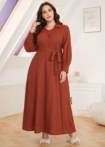 Это длинное платье выполнено из однотонного трикотажного полотна, идеально подходит для ношения осенью и зимой. Оно имеет стандартный крой с высокой талией и расклешенным подолом. Детали включают поясной дизайн, застежку на пуговицы спереди и рукава-бишоп. Ткань средней эластичности для комфортного движения.