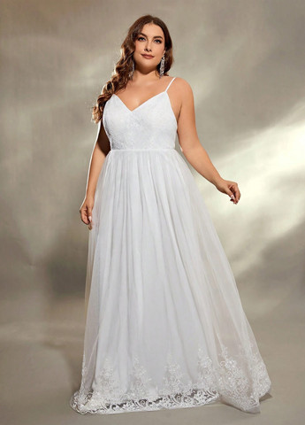 Свадебное платье А-силуэта на тонких бретелях. Вышивка из кружевной сетки и контрастные кружевные детали. Имеет застежку-молнию. Обычная посадка из неэластичной ткани.