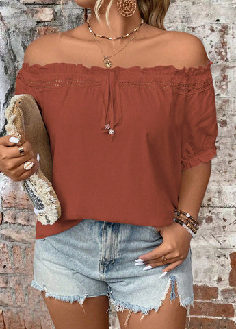 Эта блузка имеет привлекательный вырез с открытыми плечами и рукава-фонарики. Это рубашка свободного кроя с однотонной расцветкой. В дизайне использованы контрастные кружевные детали. Ткань не тянется и имеет стандартный подол.