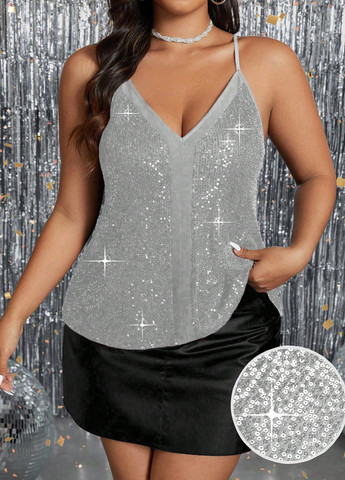 Топ SHEIN Clasi Cami Top – серебристый топ на бретельках идеально подходит для вечеринок и фестивалей. Топ имеет стандартный подол и облегающий крой. Он выполнен из ткани с пайетками, слегка тянется. Уход: машинная стирка или химчистка.