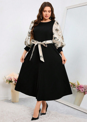 Это платье больших размеров с поясом и контрастными сетчатыми вставками. Круглая горловина и длинные рукава добавляют элегантности. Изготовлен из трикотажной ткани средней эластичности. Это удобный выбор. Цветочный узор с цветными блоками добавляет визуальный интерес. Классический крой и длина миди создают привлекательный силуэт. Расклешенный низ и завышенная талия завершают образ.