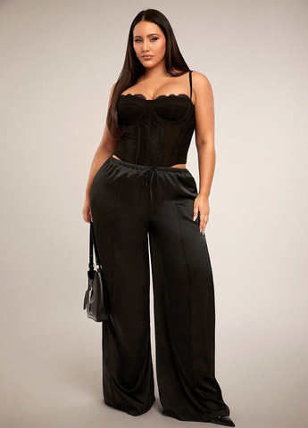 Эти черные атласные брюки предлагают удобный и стильный вариант. Они имеют высокую талию и широкие штанины. Ткань слегка тянется для удобства движения. Детали включают контрастное кружево и застежку на шнурок. Эти брюки подойдут как для повседневных, так и для официальных мероприятий.