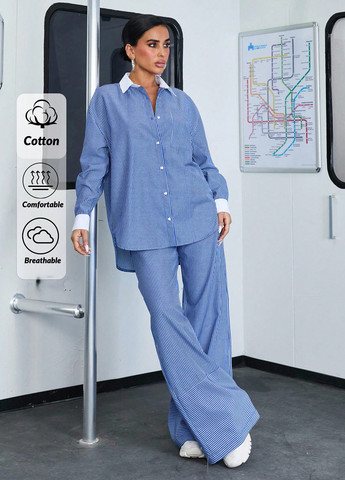 Комплект из полосатой блузы и брюк свободного кроя. Блуза с воротником и длинными рукавами. Брюки свободного кроя без подкладки. Подходит для повседневной носки весной и осенью. Рекомендуется машинная стирка.