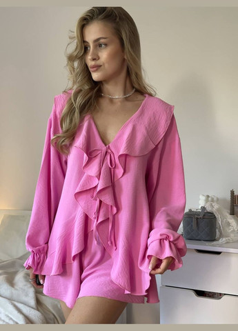 Нежный летний костюм из креп жатки – комфорт и стиль в каждой детали. Легкий дышащий комплект в трендовых цветах станет идеальным выбором для лета. Ткань креп жатка дарит приятные ощущения на коже, не просвечивается и не требует утюжка. Кофточка свободного кроя с длинными рукавами на завязках и нежным воланом смотрится очень женственно и легко. Шорты с карманами придают практичности и удобства, обеспечивая свободу движений. Модель отлично подходит для отдыха, прогулок и повседневного стиля – настоящая находка для тех, кто ценит комфорт и современный вид.