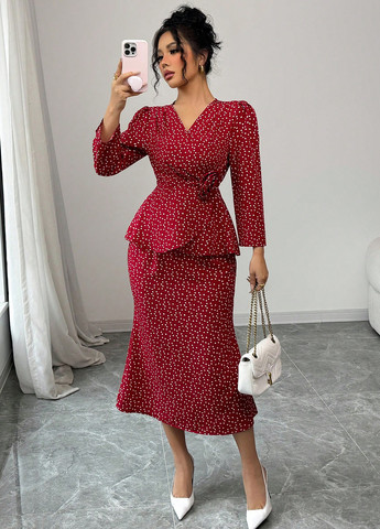 Женский комплект Chiquease из двух предметов с принтом. Этот элегантный комплект включает блузу и юбку-рыбку. Верхняя часть имеет V-образный вырез и рукава-буфы длиной 7/8. Юбка миди выполнена из тканого материала. Подходит для весны и осени. Инструкции по уходу: машинная стирка или профессиональная химчистка.