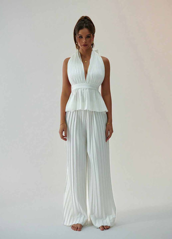 Элегантный комплект Aloruh. Этот комплект состоит из белой блузы без рукавов и брюк с высокой талией. Блуза имеет глубокий V-образный вырез и открытую спинку. Брюки удлиненные и тканые.