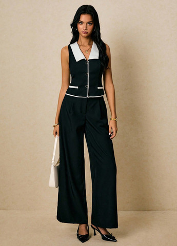 Женский повседневный комплект из двух предметов Poéselle. Этот комплект включает в себя черно-белую блузу в стиле колор-блок и укороченные брюки. Блуза без подкладки и рукавов. Брюки изготовлены из полиэстера и имеют классический крой. Инструкция по уходу: машинная стирка или химчистка.