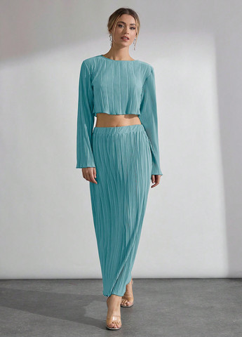 Элегантный комплект из топа и юбки RueChic с плиссировкой. Топ прямого кроя с длинными рукавами и круглым вырезом. В комплект входит плиссированная юбка макси. Этот комплект подходит для торжественных и вечерних мероприятий. Рекомендации по уходу: машинная стирка.