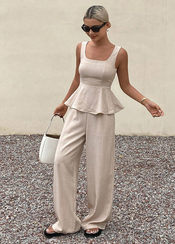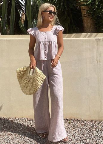 Женский повседневный костюм Livesso из двух предметов: майки и брюк. Верхняя часть на бретелях и с открытыми плечами. Брюки свободного кроя. Только машинная стирка.