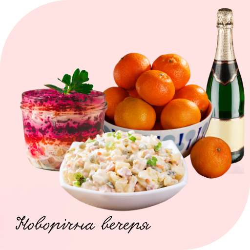 • Новогодний ужин: на стол ставят мандарины, оливье, селедку под шубой и другие блюда.