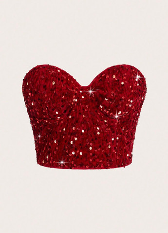 SHEIN Privé Sexy Elegant Red Beaded Campagne Cropped Top. Этот красный топ укороченной длины с вырезом без бретелек и стандартным нижним краем. Приталенный крой. Только ручная стирка.