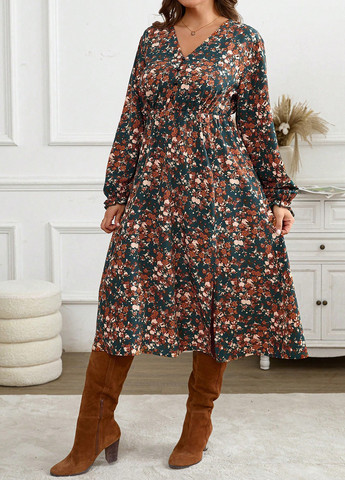 Это платье с цветочным принтом и V-образным вырезом. У него длинные рукава и расклешенный подол. Платье имеет оборчатый подол и высокую линию талии. Ткань не тянется. Это платье стандартного кроя.