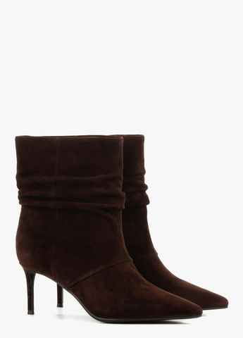 Глубокий шоколадный оттенок замши придает этим ботильонам изящный шарм, а мягкие складки на голенище придают непринужденной динамики силуэту. Узкий носок и тонкий подбор создают женственный, деликатный образ, в котором сочетается комфорт и утонченность. Идеальный выбор для тех, кто ценит сдержанную элегантность и теплоту натуральных материалов.