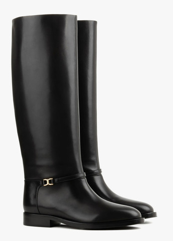 Черная гладкая кожа этих сапог излучает сдержанную роскошь и современную уверенность. Аккуратный силуэт дополнен изящной золотой деталью – элегантным акцентом, придающим образу изысканности. Высокое голенище создает удлиненную линию ноги, подчеркивая изящество формы. Плоская подошва обеспечивает комфорт в течение всего дня, не жертвуя стилем. Это обувь для тех, кто ценит гармонию лаконичности, комфорта и элегантности.