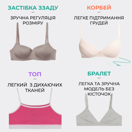 Будь внимательна к фидбеку твоего тела (или твоему подростку): обращай внимание на аллергические реакции, натертости и жалобы. Не откладывай замену или покупку другого бюстгальтера, если не угадали с формой чашки или обхвата (тело в этом возрасте так быстро меняется!). Ношение неподходящего размера только обострит дискомфорт и неловкость в ощущениях.