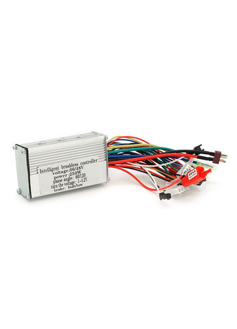 Контроллер управления для бесщеточного двигателя электротранспорта – важное звено в системе электрокомпонентов. Без контроллера электродвигатель не сможет даже запуститься, не говоря о его полноценной работе. Аккумуляторная батарея имеет 2 полюса – положительный и отрицательный, а мотор-колесо – 3 фазных провода. Потому подключить аккумулятор и двигатель невозможно. Для этого используется дополнительное звено – контроллер управления. Выполняемые функции: Именно контроллер формирует в обмотке статора мотор-колеса вращающееся магнитное поле и получает соответствующие сигналы о позиции ротора. Сигналы поступают от датчиков Холла, а при управлении моторами без датчиков позиция роторов определяется противо-ЭДС. К тому же контроллер управляет электродвигателем: - позволяет изменять скорость движения – при изменении положения ручки газа изменяется количество импульсов напряжения, подаваемых в секунду на обмотки, и вращение колеса ускоряется или замедляется; - обеспечивает рекуперацию энергии при торможении двигателем. Контроллер выступает в роли понижающего преобразователя, поэтому проходящий по обмоткам мотора фазный ток может быть гораздо выше батарейного тока, поступающего от АКБ к контроллеру. Именно от него зависит мощность, поступающая на двигатель. К примеру, при использовании мотор-колеса номинальной мощностью 1000 Вт можно быстро получать значения до 2000-2500 Вт. Главное – использовать соответствующий контроллер и постоянно контролировать температуру, чтобы не допустить перегрева двигателя. Схема контроллера для электровелосипеда или электроскутера Контроллер для электрического велосипеда или скутера имеет алюминиевый корпус, из которого выходят разноцветные провода с разъемами. для подключения разных устройств. Внутри скрыты: • главный узел – микроконтроллер; • силовые компоненты – шунты для измерения тока, конденсаторы, транзисторы; • понижающие преобразователи на 12 В и 5 В – обеспечивающие питание микроконтроллера и периферических устройств (датчиков положения, рычага газа). Схема подключения Контроллер для электроскутера, е-байка или электросамоката подключается согласно прилагаемой к нему схеме. Главное – не торопиться и внимательно разобраться с назначением проводов. Общий принцип подключения выглядит следующим образом: • Толстые провода черного и красного цветов – с соблюдением полярности подводятся к аккумуляторной батарее. При этом может появиться «искра» и даже возможное подгорание разъемов. Это нормально – так заряжаются конденсаторы на входе контроллера. Чтобы исключить искрение, достаточно ненадолго соединить контроллер и АКБ через резистор с сопротивлением в десятки Ом или воспользоваться лампочкой. Когда зарядятся конденсаторы, контроллер можно спокойно соединить с АКБ без посредников. • Тройка толстых проводов разных цветов – обеспечивает подключение к фазным проводам 3-фазного электромотора. • Связывание из 5 тонких разноцветных проводов – идет к проводкам мотор-колеса, обеспечивающим питание и передачу сигналов от датчиков положения. • Отдельный красный провод – зажигание. При его замыкании на плюс АКБ происходит включение контроллера. • Тройка тонких проводов (обычно черная, красная и зеленая) – для подключения ручки газа. Характеристики: • Размер корпуса, 