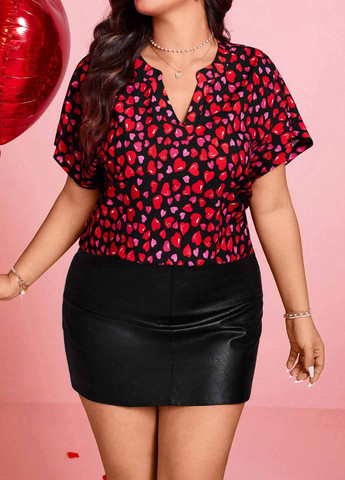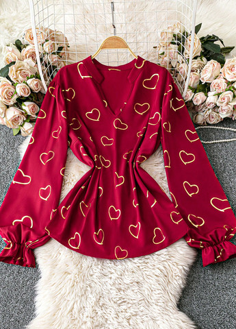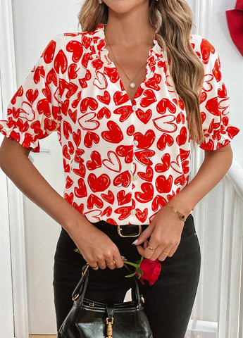 Легкая воздушная ткань красиво ложится по фигуре и обеспечивает максимальное удобство в течение дня. V-образный вырез изящно подчеркивает шею и придает женственности, а свободный крой и разрезы по бокам делают блузку универсальной для любой фигуры. Оригинальный принт в виде сердечек создает романтическое настроение и дарит особый шарм. Эта модель легко сочетается как с джинсами для повседневного стиля, так и юбками или классическими брюками для более элегантного образа. Идеальный вариант на работу, встречу или прогулку!