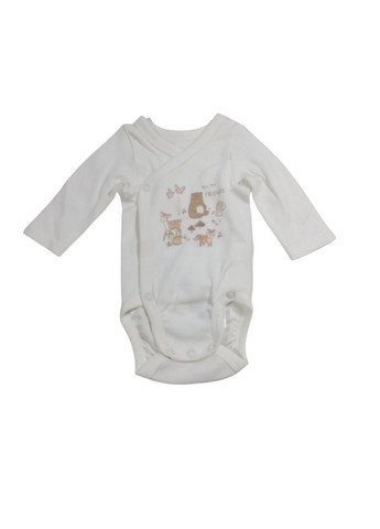 Комплект из боди и брюк из мягкого хлопкового трикотажа. Боди с длинными рукавами и круглым вырезом горловины с застежкой на кнопки, а также застежка на кнопки в промежности. Брюки с эластичным отворотом на талии. В изделии возможно повреждение бирки.