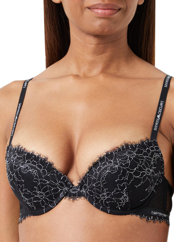 Женский бюстгальтер Emporio Armani. Бюст пуш-ап для придания желаемого объема, вставки съемные. Кружевной бюстгальтер с блестящим вышитым логотипом на спинке и блестящими вставками на бретелях. Лиф благодаря своему дизайну выглядит стильно и нежно одновременно. Очень удобный, с косточками, мягкий и комфортный бюст на каждый день. Уплотненная мягкая чашка с вставками Push Up, которые при необходимости можно снять. Сзади сеточка с вышивкой. Регулируемые бретели. Сзади застежка на крючки. Отличное качество.