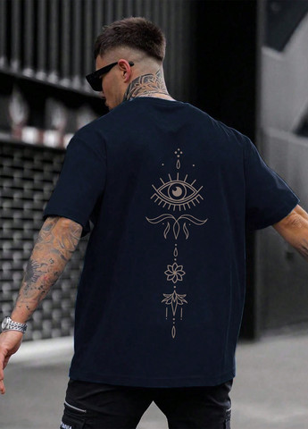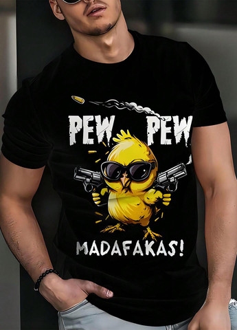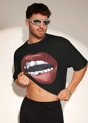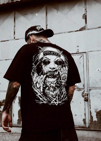 Эта чёрная футболка унисекс с принтом. Она изготовлена из трикотажной ткани из смеси полиэстера, хлопка и эластана. У футболки круглый вырез горловины и короткие рукава. Она имеет свободный крой и среднюю эластичность. Рекомендации по уходу: машинная стирка или профессиональная химчистка.