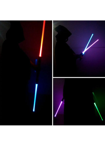 В состав набора входит ДВА световых меча и соединитель. Мечами можно играть отдельно, а можно соединить в один двухклиночный. По умолчанию цвет меча автоматически меняется при столкновении или сильном взмахе, а также вручную нажатием кнопки. Принцип работы: три светодиода (красный, зеленый, синий) формируют один из 7 цветов, изменяющихся от толчка или удара. При необходимости можно зафиксировать один из любимых цветов. Каждый меч издает эпические звуки, но их можно отключить (бесшумный режим). Длина меча 66 см соответственно при объединении двусторонний меч будет иметь длину 132 см. Обратите внимание, наши мечи обладают улучшенной по сравнению с другими похожими предложениями конструкцией, а именно фланцевым фиксатором светораспределительной пленки внутри колбы, надежно фиксирующей пленку в колбе, а колбу в рукоятке. Питание каждого меча – от 3 микропальчиковых батареек ААА (в комплект не входят). Для питания подходят и обеспечивают длительную работу любые недорогие щелочные батареи. Заводской упаковкой мечей является прозрачный чехол для сохранения целостности при транспортировке, мы бесплатно для Вас упаковываем их дополнительно в 3 слоя воздушно-пузырчатой пленки + картонный тубус. ВНИМАНИЕ! Игрушка сделана полностью из пластика и предназначена для игры, а не для боя. Не оставляйте маленьких детей играть с оружием! Игра световыми мечами должна происходить только под наблюдением взрослых.
