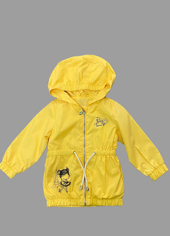 Легкая удлиненная ветровка с капюшоном и карманами по бокам для девочки. Непромокаемая и ветрозащитная. Застегивается на молнию, подкладка из мягкого трикотажа с принтом, на талии регулируется кулиской, на рукавах эластичный манжет. Куртка украшена рисунком. Цвет: жолтый. Состав: верх: плащевая ткань 100% полиэстер, подкладка: трикотаж 100% хлопок. Производство Украины.