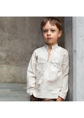 На первый взгляд – классическая льняная рубашка. Но присмотритесь поближе: объемные рукава, деликатные завязки с кистями, и — главное — авторская вышивка крупных незабудок, распускающихся на груди и рукавах. Это не случайный узор, а история о детстве, которое хочется сохранить в цвете, текстуре, осязании.