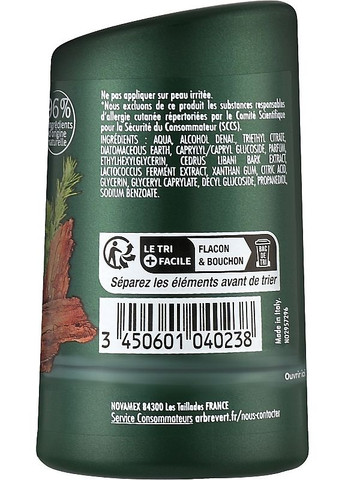 Дезодорант для мужчин с экстрактом кедра О невероятных восстановительных свойствах сосновых деревьев знают многие, но только специалистам французского бренда L'Arbre Vert удалось поместить широкий спектр функций душистых растений в компактном флаконе дезодоранта. Универсальный продукт, изготовленный для активных мужчин, обогащен натуральным экстрактом кедра – полезным микроэлементом, необходимым для быстрой регенерации и обновления кожи. Deodorant лишает ее механических повреждений, признаков дегидратации, других недостатков, спровоцированных агрессией среды, и предотвращает их повторное образование. Помимо высококачественного ухода, компактное средство отличается совершенным исполнением своих основных обязанностей – оно не оставляет шанса на существование неприятных запахов, прекрасно освежая, тонизируя тело, расслабляя сознание. Особенности Deodorant от L'Arbre Vert: - представлен в компактном флаконе тревел-формата; - оснащен практическим роликовым аппликатором; - имеет насыщенный, но ненавязчивый аромат; - совсем не диссонирует с парфюмерией; обеспечивает восстановление ее поврежденных зон; - деликатно смягчает загрубевшие участки; - имеет нейтральный уровень pH; - без спирта. Наносить на чистую сухую кожу в области подмышек. Состав Aq, Alcohol Denat., Triethyl Citrate, Diatomaceous Earth, Caprylyl/Capryl Glucoside, Parfum, Ethylhexylglycerin, Cedrus Libani Bark Extract, Lactococcus Ferment Extract, Xanthan Gum, Citric Acid, Glyceryl Caprylate Benzoate.