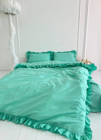 Двухспальный комплект постельного белья изготовлен из бязи Голд Люкс – крепкой, дышащей ткани, которая не линяет, не лохматится и долго сохраняет свой первоначальный вид. Комплект включает пододеяльник размером 175х210 см, простыню 200х220 см и две наволочки 50х70 или 70х70 см. Наволочки и пододеяльник украшены по краям нежными декоративными рюшами, которые придают комплекту изысканность и элегантность. Материал приятен к телу, не вызывает аллергии и обеспечивает комфортный сон в любое время года. Комплект имеет освежающий мятный оттенок, создающий атмосферу покоя и релакса. Поставляется в стильной подарочной коробке, что делает его отличным вариантом для подарка.
