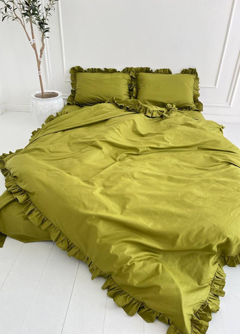 Двухспальный комплект постельного белья изготовлен из бязи Голд Люкс – крепкой, дышащей ткани, которая не линяет, не лохматится и долго сохраняет свой первоначальный вид. Комплект включает пододеяльник размером 175х210 см, простыню 200х220 см и две наволочки 50х70 или 70х70 см. Наволочки и пододеяльник украшены по краям нежными декоративными рюшами, которые придают комплекту изысканность и элегантность. Материал приятен к телу, не вызывает аллергии и обеспечивает комфортный сон в любое время года.Комплект имеет стильный и универсальный цвет хаки, гармонично сочетающийся с естественными оттенками. Поставляется в стильной подарочной коробке, что делает его отличным вариантом для подарка.