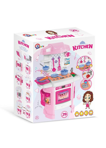 Кухня с плитой, духовкой, полочками, вытяжкой. В набор также входят 2 чашки, кастрюля, чайник, кухонные приборы. Дверцы духовки открываются. Игрушка упакована в картонную коробку.