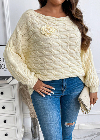 Этот свитер имеет дизайн во французском стиле. Он доступен в размерах плюс и включает цветочную аппликацию. Свитер имеет стандартный крой и асимметричный подол. Он имеет фактуру из косичек. Рукава стандартного кроя. Ткань средней эластичности. Вырез горловины — лодочка.