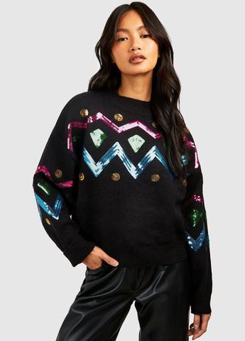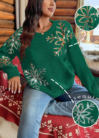 Джемпер с пайетками больших размеров. Подходит для осени, зимы и рождественских мероприятий. Свитер имеет стандартный крой и круглый вырез горловины. Подол имеет правильную форму, а рукава имеют спущенное плечо.