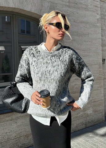 Изделие представляет собой свитер с длинными рукавами. Имеет геометрический принт. Свитер серого цвета, стандартной посадки. Он изготовлен из эластичной ткани с круглым вырезом и ровным подолом.