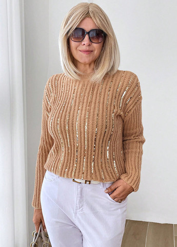 Стильный и очень теплый джемпер приталенного кроя, укороченный. Имеет декор в виде нашивки из пайеток.