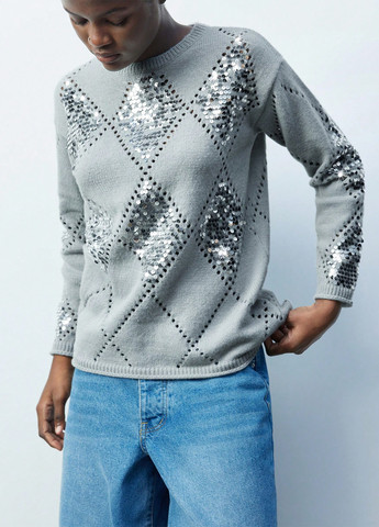 Этот свитер обеспечивает свободную посадку. Он имеет круглый вырез и рукава со спущенным плечом. Свитер изготовлен из ткани средней эластичности. Контрастная деталь из пайеток добавляет визуальный интерес. Подол имеет форму для стандартной посадки.