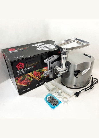 Электрическая мясорубка Domotec MS-2023 2800W предназначена для изготовления фарша из мяса, рыбы, грибов, нарезки овощей и фруктов, профилирования песочного и пельменного теста. Электромясорубка шнекового типа имеет функцию реверс, что предотвращает уплотнение продуктов внутри мясорубки и обеспечивает качественное измельчение. Корпус изготовлен из нержавеющей стали и ударопрочного пластика. Есть прорезиненные антискользящие ножки. В комплектацию входят набор решеток для приготовления фарша, насадки для колбас и кеббе, пластиковый толкатель, насадка для сока. Характеристики: Тип: Электрическая мясорубка; Мощность: 2800 Вт; Система реверса; Защита двигателя от перезагрузки; Прочный металлический шнек; Резиновые ножки для дополнительной устойчивости; 3 насадки с отверстием разного диаметра: 3 мм, 5 мм, 7 мм; Корпус выполнен из нержавеющей стали; Низкий уровень шума. Комплектация: Мясорубка; Набор насадок для колбас и кеббе; Пластиковый толкатель; Набор сеточек для фарша – 3 мм, 5 мм, 7 мм; Насадка для сока; Упаковка.
