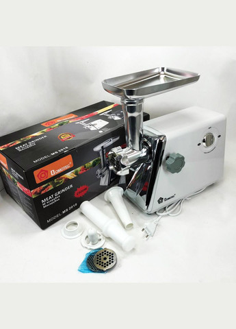 Перед вами не просто бытовая электрическая мясорубка Домотек, а многофункциональный, компактный, высокоэффективный и надежный помощник на кухне. Бургеры, колбаски, домашние сосиски- все это волшебство Вам запросто накрутит наша электро мясорубка DOMOTEC MS-2024, она готова взяться за самые сложные задачи: измельчить, прокрутить и превратить мясо в нежный фарш. Электрическая мясорубка с функцией соковыжималки Domotec MS-2024 с насадкой для томатов и 2-мя функциями измельчения, нарезки и нарезки ломтиками. Мясорубка Домотек для дома предназначена для изготовления фарша из мяса, рыбы, грибов, нарезки овощей и фруктов, профилирования песочного и пельменного теста. Электромясорубка с функцией соковыжималки шнекового типа имеет функцию реверс, обратное вращение ножей, что предотвращает уплотнение продуктов внутри мясорубки и обеспечивает качественное измельчение. Так же в наборе насадка для приготовления домашнего томатного или другого сока. Шнек и три формовочных диска для измельчения и рубки выполнены из нержавеющей стали. В процессе эксплуатации вы сможете использовать функцию «Реверс», которой оснащена модель -для очистки спирали от намотавшихся на нее волокон можно использовать реверсный ход, который раскручивает шнек в обратном направлении и таким образом освобождает его. Есть 2 вида терок шинковок, набор решеток для измельчения мяса, насадки для филирования теста, крестообразный нож, металлический лоток для продуктов, толкатель, насадка «куббе», с помощью которой вы легко сделаете колбаску в домашних условиях, а также насадку соковыжималку. Данная мясорубка с соковыжималкой отлично справится с мясом, рыбой, овощами и фруктами. Характеристики бытовой электрической мясорубки Домотек: Функция Реверс; Защита от перегрузки; Медный двигатель; Количество решеток: 3; Материал корпуса: Пластик/ Металл; Насадки: Для колбасных изделий; Кеббе; Для томатов; 2 Для терки/шинковки; Особенности: Не скользящие резиновые ножки; Широкий лоток; Низкий уровень шума; Сфера использования: Для дома. Комплектация: Электрическая бытовая мясорубка с функцией соковыжималки; 3 вида форменных дисков; Крестообразный режущий нож; Лоток для мяса; Насадки для колбас и кеббе; Насадка для томатов; 2 насадки для терки/шинковки; Инструкция.