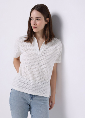 Поло тонкой вязки с воротником, планкой на пуговицах, слегка спущенными плечами и длинными рукавами. Ребристые манжеты и подол.