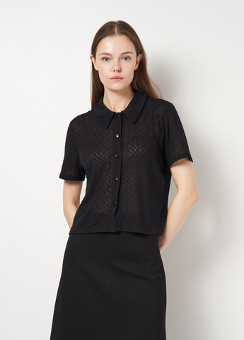 Отложной воротник поло с V-образным вырезом придает образу элегантности, а вертикальная ребристая фактура визуально вытягивает силуэт.