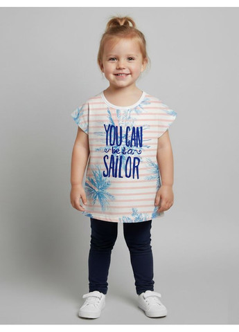 Детская футболка свободного кроя с коротким рукавом. Модель выполнена в розово-белую полоску с голубым тропическим принтом и крупной надписью YOU CAN BE A SAILOR спереди. Лёгкая и удобная, идеально подойдёт для повседневных прогулок и летнего отдыха.