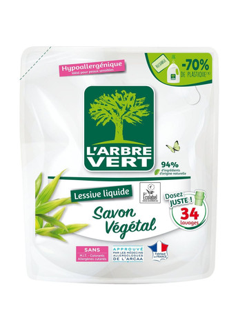 Растительное мыло имеет формулу из экологически чистых компонентов, которые безопасны для окружающей среды и людей с чувствительной кожей, имеет нейтральный PH для кожи и предназначен для минимизации риска возникновения аллергии – гипоаллергенна. Основные преимущества: не содержат веществ животного происхождения без изотиазолинона или его производных без метилизотиазолинон (MIT) упаковка пригодна к 100% переработке компоненты средства не загрязняют сточные воды и септики Способ применения: рекомендованная дозировка для мягкой или средней жесткости воды и умеренно загрязненного белья. Добавьте 15 мл моющего средства для жесткой воды или очень грязного белья (например, 60 мл для умеренно жесткой воды, очень грязного белья и загрузки 4.5 кг). Правильная дозировка с соблюдением минимальной рекомендуемой температуры (30°C), инструкции по использованию и работе стиральной машины с полной загрузкой позволяет оптимизировать производительность изделия, минимизировать образование отходов, потребление энергии и воды и уменьшить загрязнение воды. Характеристики Производитель: L'Arbre Vert, Франция.