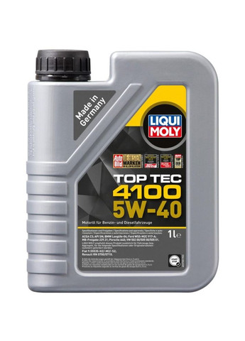 Моторное масло Liqui Moly Top Tec 4100 (1 л, 5W-40) для бензиновых и дизельных двигателей В основе моторного масла Top Tec 4100 лежит сочетание нетрадиционных базовых масел, полученных в результате применения новейших технологий высокотемпературного синтеза и современного пакета присадок. Top Tec 4100 обеспечивает отличную защиту от износа, экономию топлива за счет снижения внутренних потерь в двигателе и устойчивость характеристик вплоть до 30000 км. пробега, согласно указаниям производителя автомобиля. Масло соответствует нормам Евро-4,5,6 и особенно рекомендуется для легковых и легких коммерческих дизелей, оснащенных сажевым фильтром DPF. Благодаря низкой зольности, масло идеально подходит для бензиновых двигателей, работающих на сжатом или сжиженном газе (CNG/LPG). Характеристики: Классификация: API SN; ACEA C3Допуски/Рекомендации: BMW Longlife-04; Форд WSS-M2C 917-A; MB 229.31; VW 505.00; VW 505.01; Porsche A40; Renault RN 0700; Renault RN 0710; Fiat 9.55 535 H2; Fiat 9.55 535 M2; Fiat 9.55535 S2; GM dexos 2Класс: 5W-40Тип масла: синтетическоеОбъем: 1 л Комплектация: Моторное масло Liqui Moly – 1 л