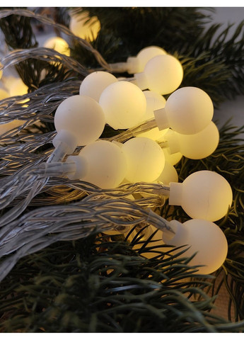 Длина: 6 м Диаметр шарика: 1,8 см Тип питания: 3 батарейки типа АА Режимы свечения – обычный, не мигающий Количество шариков: 40 шт Материал шарика: пластик Цвет шарика: прозрачный Цвет свечения: теплый белый
