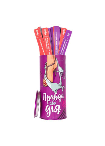 Думаете, что уже все перепробовали со своим партнером? Уверены? А ну-ка, бросьте вызов себе и вашей второй половинке. С «Правда иди дело» вам предстоит узнать много нового о вашем партнере, а также проявить себя. А, возможно, вы сможете осуществить что-то, о чем в тайне давно мечтали, но стеснялись попросить. С нашей игрой вам не придется ничего придумывать – мы все уже придумали за вас=) Коротко о правилах: Вы по очереди спрашиваете друг друга «Правда или Дело?». Если выбрали «Дело» - тяните стик и выполняйте задание с его фиолетовой стороны. «Правда» - вам необходимо ответить на вопрос с красной стороны стика. Нельзя выбирать одно и тоже задание более двух раз подряд. Вы можете отказаться от выполнения «Дела» или «Правды» не более двух раз за игру. После третьего отказа другой игрок(и) назначает вам наказание(фантазируйте:))), которое обязано быть выполнено. В игре нет ни победителей, ни проигравших – главное участие. Расслабьтесь, будьте честны и настойчивы, и вы получите от игры максимум удовольствия :) Тип игры: Романтические, 18+ В комплекте: 50 дел и 50 вопросов Материал: ламинированный картон Производитель: Fun Games Shop, Украина Характеристики: Состояние: новое Возрастная группа: От 18 лет Языки: Украинский Материал: Ламинированный картон Тип: Настольная игра Цвет: Разные цвета Упаковка: тубус Вид: Фанты Вес товара: 0.2 Габариты: длина: 16 Габариты: ширина: 7 Габариты: высота: 7 Назначение: для взрослых Возраст: от 18 лет Жанр: романтические Гарантия: 14 дней Пол: унисекс Количество игроков: Для 2-х Страна регистрации бренда: Украина Страна-производитель товара: Украина