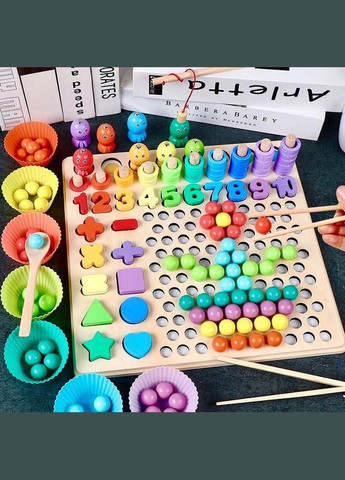 По методике Монтессори Такая необычная деревянная игрушка станет настоящим развивающим центром для ребенка. В наборе более 5 игр, а именно: Рыбалка на магнитах (вылавливать рыбок из имитированного водоема с помощью магнитной удочки) Шнуровка-ожерелье; Вложишь с цифрами и фигурами; Мозаика; Сортер с щипцами и силиконовыми формами; Игра помогает развивать мелкую моторику, логику, внимательность, воображение, фантазию. В комплекте: Основа деревянная 5 разноцветных корзин 60 шаров (12 штук каждого цвета) Пинцет Рыбалка Силиконовые формы - корзины для сортировки и хранения шаров ,5-5 см
