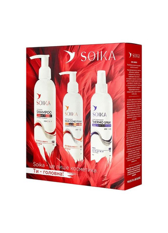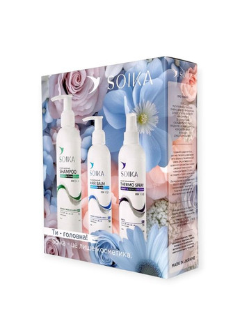 Набор косметики для всех типов волос Soika 3 в 1 — шампунь, бальзам, спрей-термозащита Набор для волос Soika 3 в 1 — первая многофункциональная линейка бренда для всех типов волос: сухих, жирных, нормальных. Средства бьюти-бокса делают локоны блестящими, сильными, послушными. Косметика обладает нейтральным уровнем pH. Это позволяет использовать продукты по уходу за волосами довольно часто: ежедневно - в случае жирного типа волос, 2-3 раза - по сухому типу волос. Активные компоненты косметических средств набора для волос Soika 3 в 1: гидролат гамамелиса: очищает кожу головы, борется с перхотью, регулирует работу сальных желез; гидролат арники: укрепляет волосы, стимулирует рост, снимает раздражение кожи головы; витаминный комплекс: питает и увлажняет волосы, борется с ломкостью и выпадением. кератин: восстанавливает структуру волос, делает его более крепким, эластичным и блестящим. Состав набора для ухода за волосами Soika 3 в 1 Мягкий ежедневный шампунь, 300 мл. Подарите своим волосам максимальную заботу с набором для волос SOIKA 3 в 1! Мягкий ежедневный шампунь «Очистка и увлажнение», 300 мл. Деликатно очищает кожу головы и волосы, не повреждая защитный слой эпидермиса. Шампунь укрепляет пряди и защищает от выпадения, ломкости, нормализует жировой обмен. Обладает рН 5,2, близким к естественным показателям кислотности кожи головы (5,5). Кондиционирующий бальзам «Увлажнение и восстановление», 200 мл Бальзам активно регенерирует волосы, удаляет сухость, пушистость, предотвращает появление секущихся кончиков. Регулярно применяя бальзам, вы заметите, как пряди приобретают здоровье, гладкость, эластичность, естественный блеск. Легкая формула не отягощает пряди, сохраняя объем. Спрей-термозащита для волос, 200 мл. Гидролат кератина встраивается в волоски, восстанавливая их структуру и обеспечивая внешнюю защиту от горячего воздуха, других неблагоприятных факторов. Спрей обладает превосходными кондиционирующими свойствами, облегчает расчесывание. Не склеивает пряди.